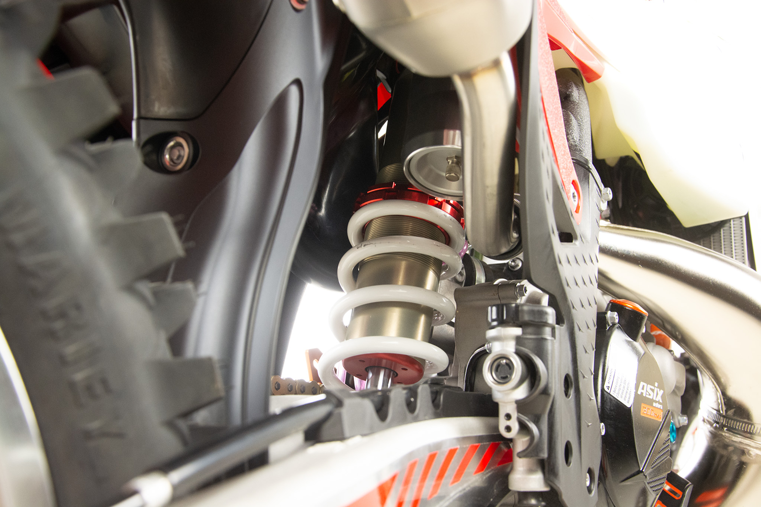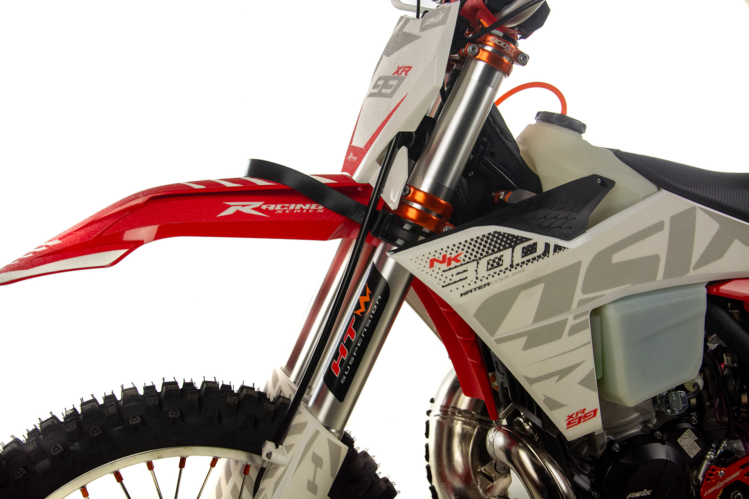 XR99 300RS 2T otrzymał całkiem nowe zawieszenie przednie oraz tylne HTW. Z przodu mamy do dyspozycji dwukomorowe lagi z regulacją odbicia i dobicia. Dzięki dwóm komorom praca zawieszenie jest bardzo płynna i nie występuje tu efekt "dobijania" zawieszenia. Ponadto lagi zostały wyposażone w odpowietrzniki oraz wejście do nabicia ich azotem. Tylny amortyzator posiada regulację twardości oraz możliwość ustawienia szybkiej i wolnej kompresji, co wpływa na zmianę prędkości pracy amortyzatora. Wolna kompresja odpowiada za dobijanie na zakrętach i małych nierównościach, a szybka za skoki i twarde lądowania
