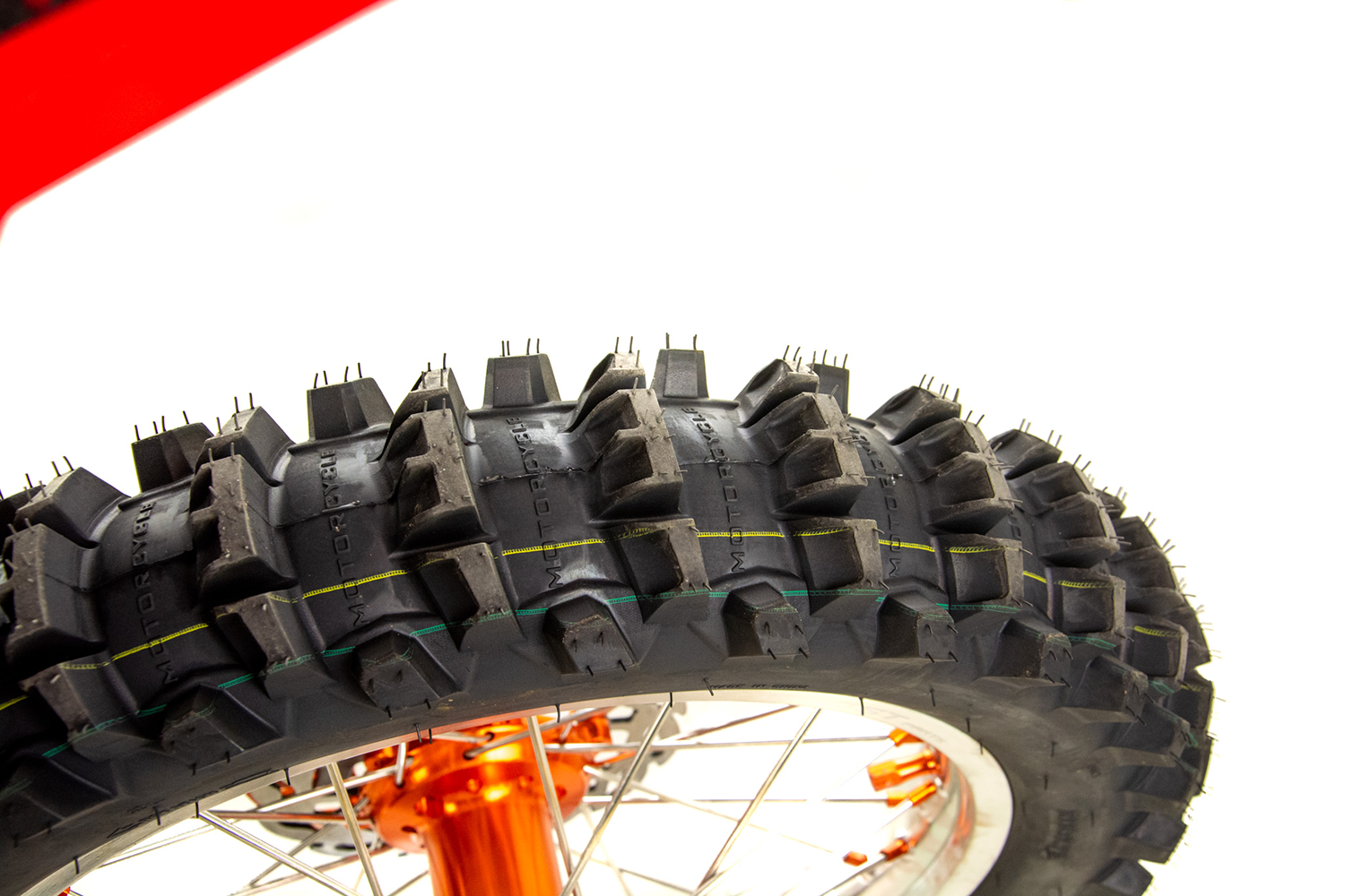 XR99 2T zestawiony jest na aluminiowych, wzmocnionych felgach w rozmiarach 21" z przodu oraz 18" z tyłu. Felgi zostały zaopatrzone w trzymaki dętki, co zapobiega niekontrolowanemu przemieszczeniu się i uszkodzeniu dętki. W tym modelu zastosowaliśmy opony MARIEV z nowym bieżnikiem. Tylna opona z bieżnikiem "łopatowym"